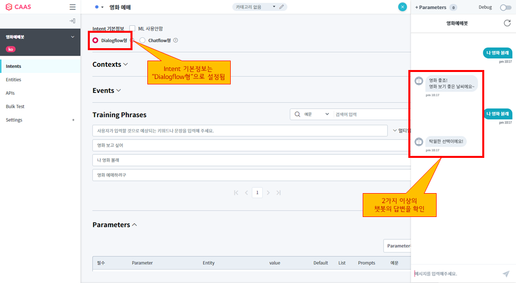 이번 따라하기에서는 “영화 예매” 의도를 발화한 사용자에게 챗봇이 어떻게 답변을 할지를 Google DialogFlow형 답변 방식으로 설정하는 실습을 해보겠습니다.