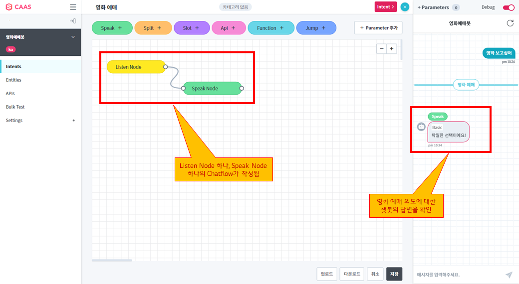 이번 따라하기에서는 “영화 예매” 의도를 발화한 사용자에게 챗봇이 어떻게 답변을 할지를 Chatflow형 답변 방식으로 설정하는 실습을 해보겠습니다.