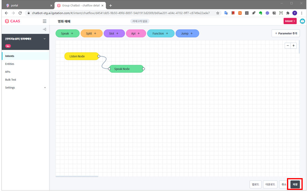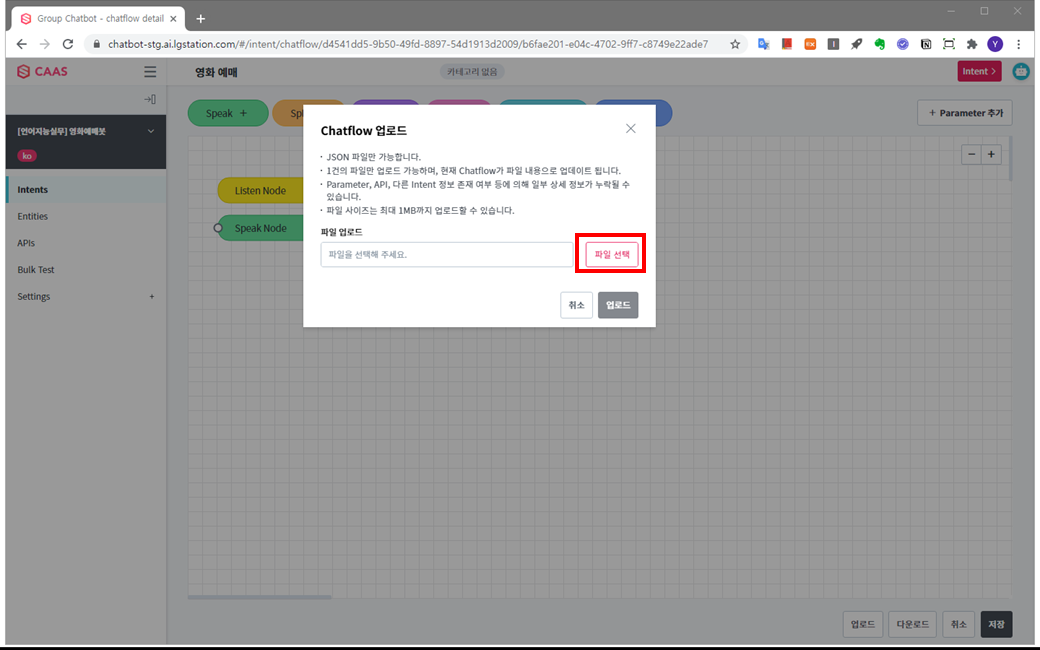 업로드 하시면, 기존에 직접 작업하던 Intent 상세 내역이 업로드 한 파일의 내용으로 갱신되니 본인의 작업을 유지하기 위해서는 작업하던 Intent명을 “영화 예매”가 아닌 다른 이름으로 변경해 주세요.