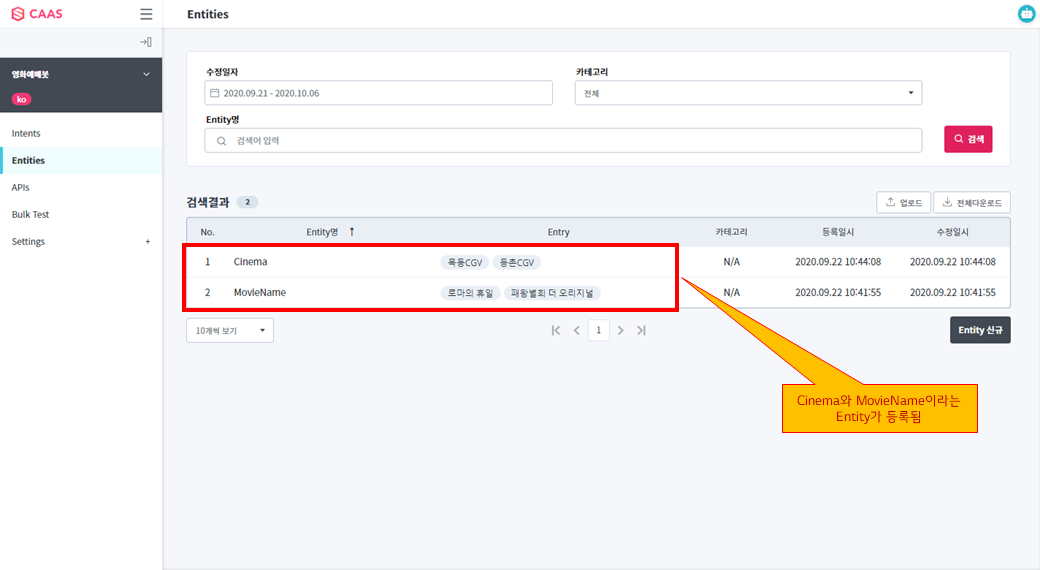 이번 따라하기에서는 “영화 예매” 의도에서 추출할 정보 유형 중 도메인에 특화된 Entity를 신규로 등록해보는 실습을 해보겠습니다.