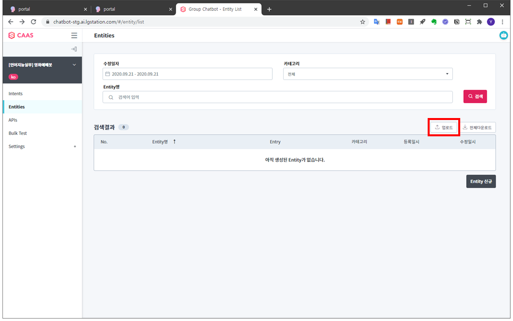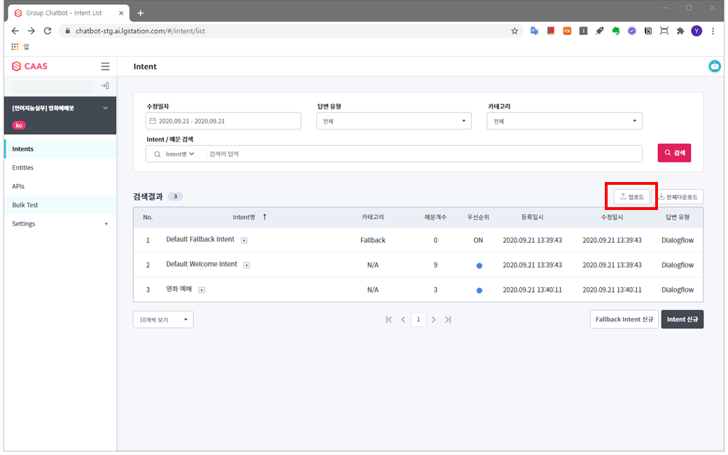 1) Intent 목록조회 화면에서 목록 위에 업로드 버튼을 클릭합니다.