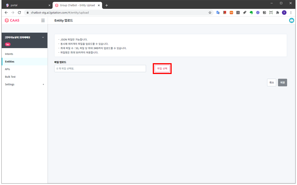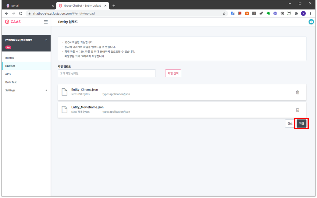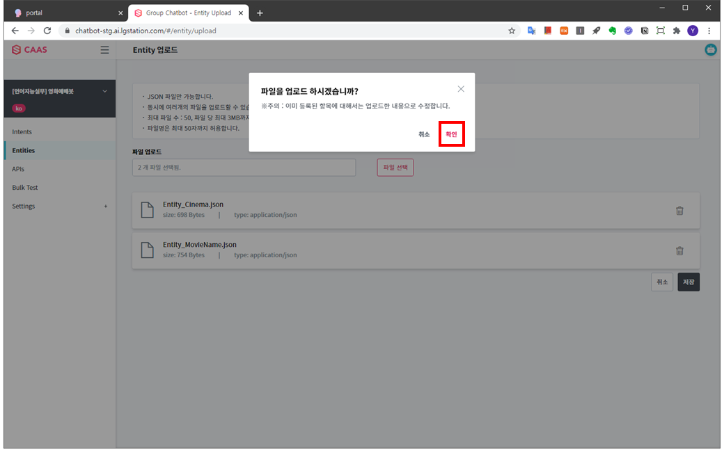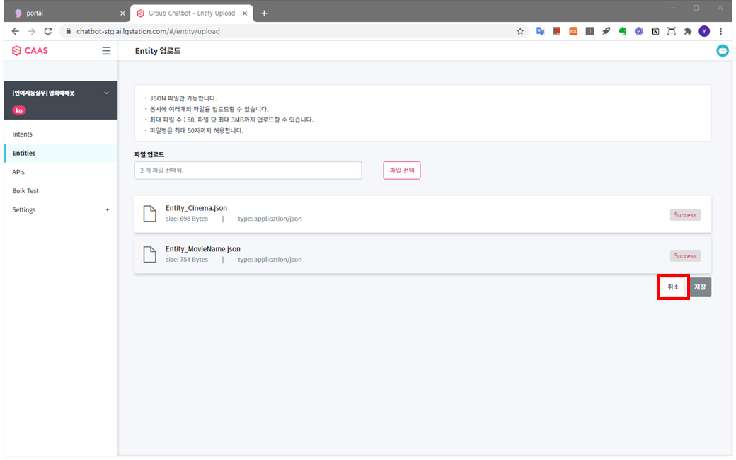 2) Entity 업로드 화면에서 파일 선택 버튼을 클릭해 다운로드 한 “Entity_MovieName.json”과 “Entity_Cinema.json” 파일을 선택합니다.