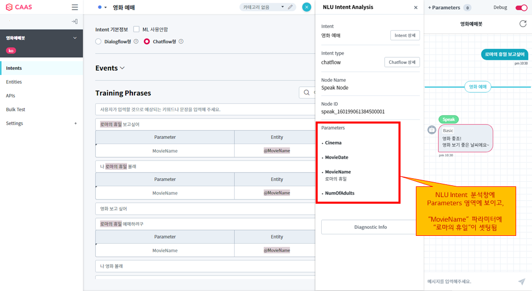 이번 따라하기에서는 “영화 예매” 의도에서 추출할 정보된 정보를 담고 있을 변수(Parameter)를 등록해보는 실습을 해보겠습니다.