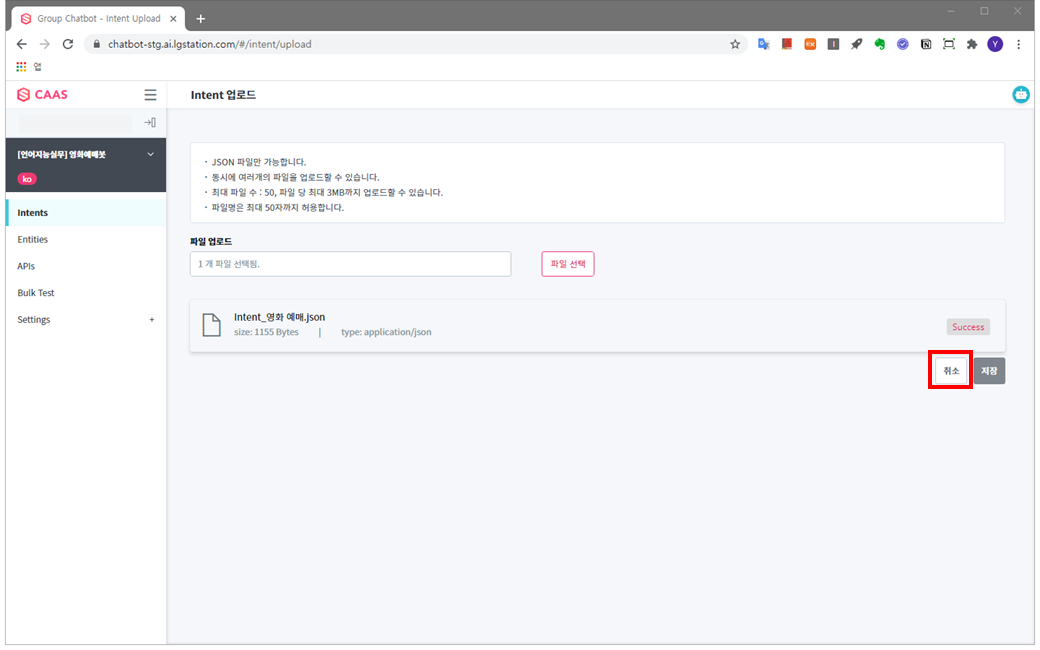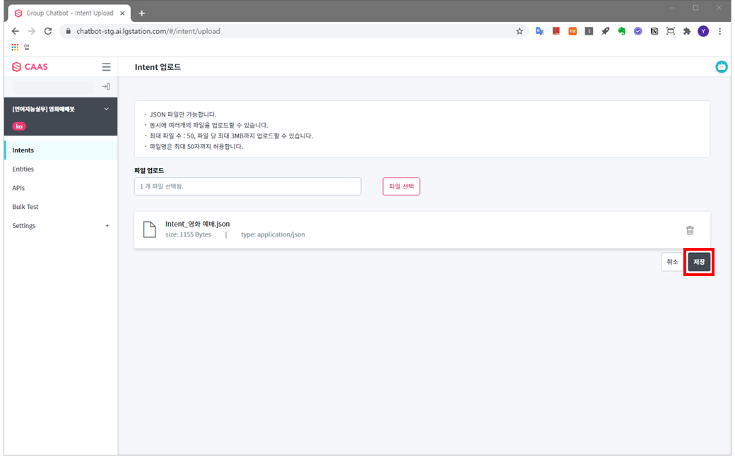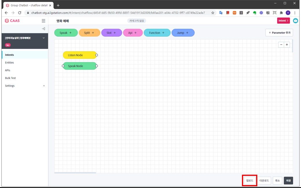업로드 하시면, 기존에 직접 작업하던 Intent 상세 내역이 업로드 한 파일의 내용으로 갱신되니 본인의 작업을 유지하기 위해서는 작업하던 Intent명을 “영화 예매”가 아닌 다른 이름으로 변경해 주세요.
