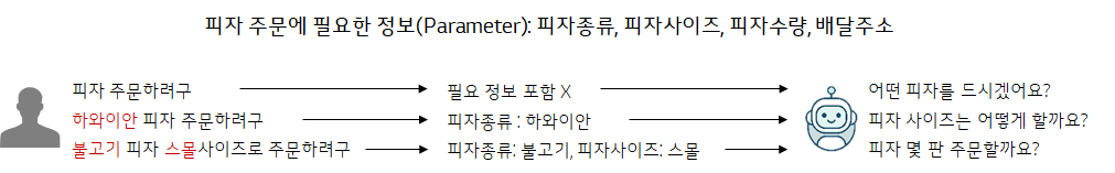 피자 주문을 대신하는 챗봇은 어떤 정보들이 필요할까요? 어떤 피자를 주문할지, 몇 판이나 주문할지, 사이즈는 어떻게 선택할건지, 배달은 어디로 해야하는지 등이 필요할 겁니다.