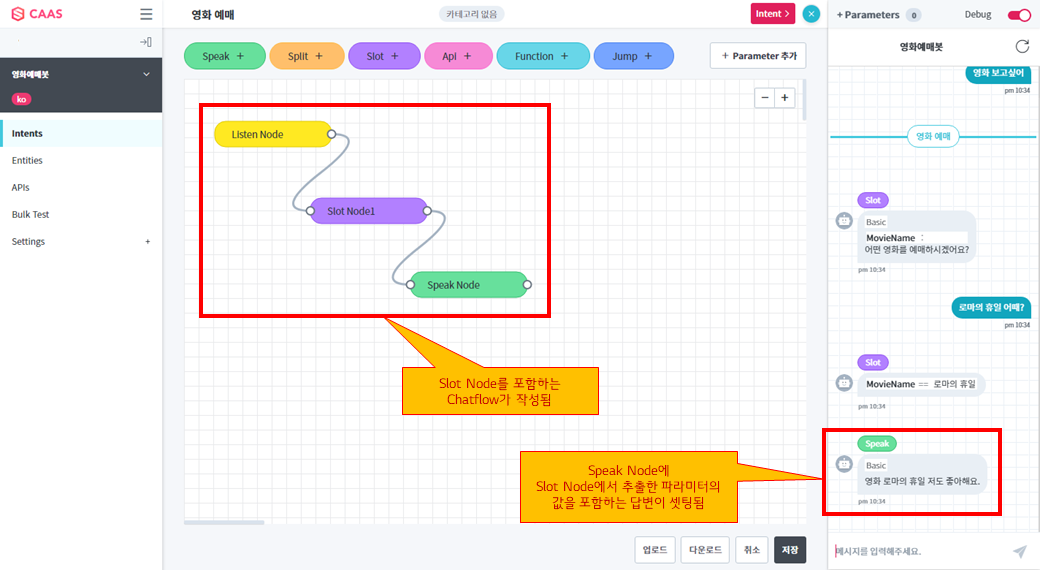 Slot node에는 원하는 Intent Parameter를 얻기 위한 질문을 설정할 수 있으며 질문을 통해 얻은 답을 해당 Parameter의 값으로 저장하게 됩니다.