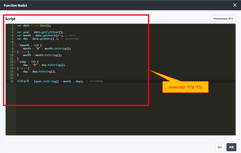 3) Function Node는 개발언어가 익숙한 챗봇 개발자를 위해 Javascript를 직접 작성해 대화 흐름을 처리하도록 지원합니다.