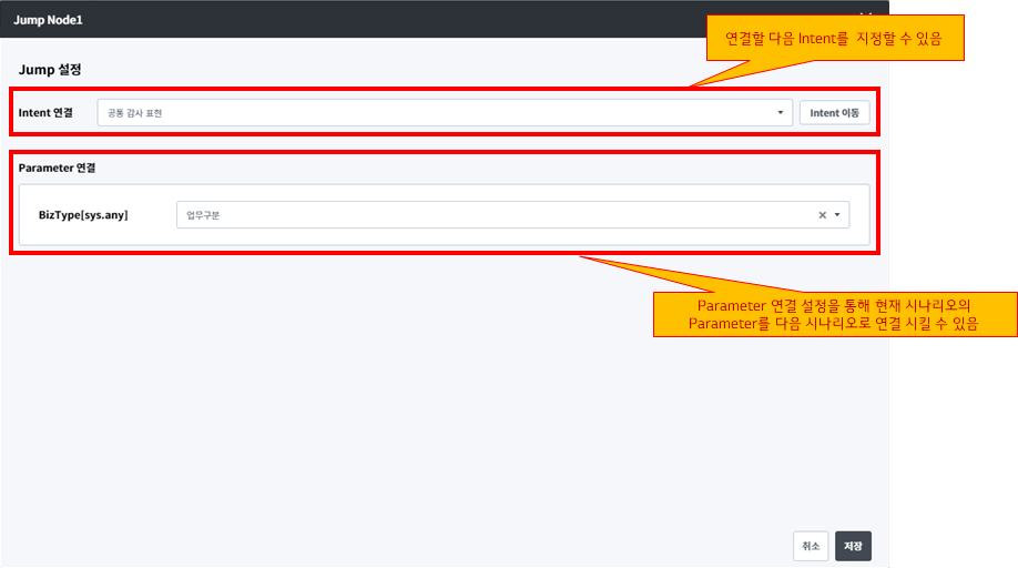 Intent Parameter명을 직접 불러와 코딩으로 편집이 가능하고, 복잡하거나 시스템적인 조건에 값에 따라 시나리오를 설계 하고 싶을 때, 화면에서 UI로 처리하는 한계를 극복할 수 있도록 도와줍니다.