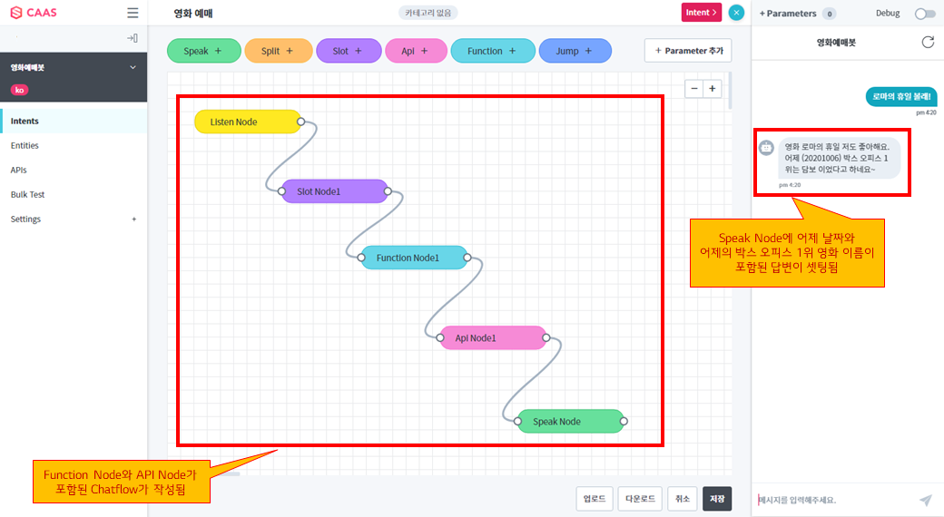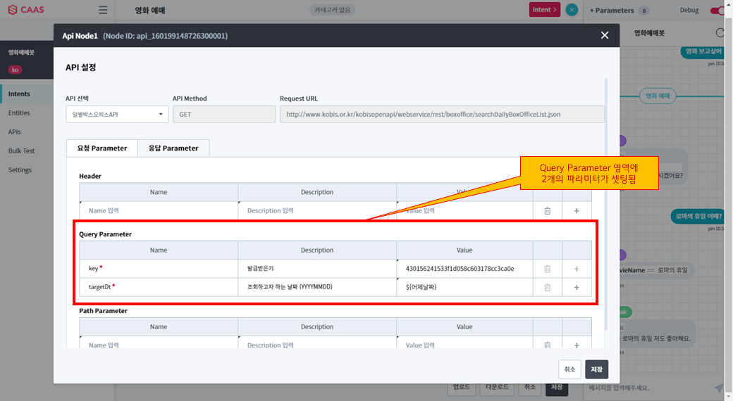 이번 따라하기에서는 “영화 예매” 의도에 대한 대화 시나리오에서 외부 API를 활용하기 위해 API를 등록해보고, API Node를 살펴보는 실습을 해보겠습니다.