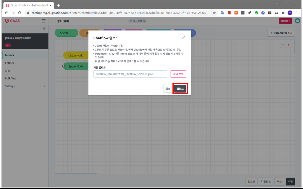 1) Chatflow 편집 캔버스 하단에 있는 업로드 버튼을 클릭합니다.