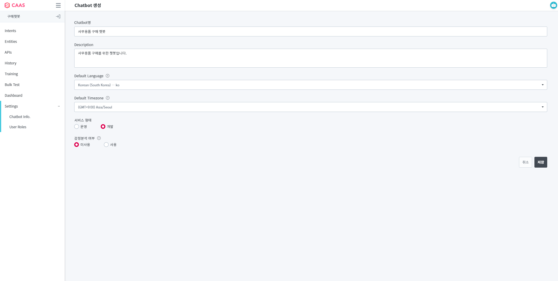 Chatbot을 생성하기 위한 과정은 간단합니다. Chatbot 생성에 필요한 정보들을 입력한 뒤 “저장” 버튼을 클릭합니다. 감정분석 사용은 서비스 형태가 운영일 때만 가능하며 Description은 입력하지 않아도 저장이 가능합니다.