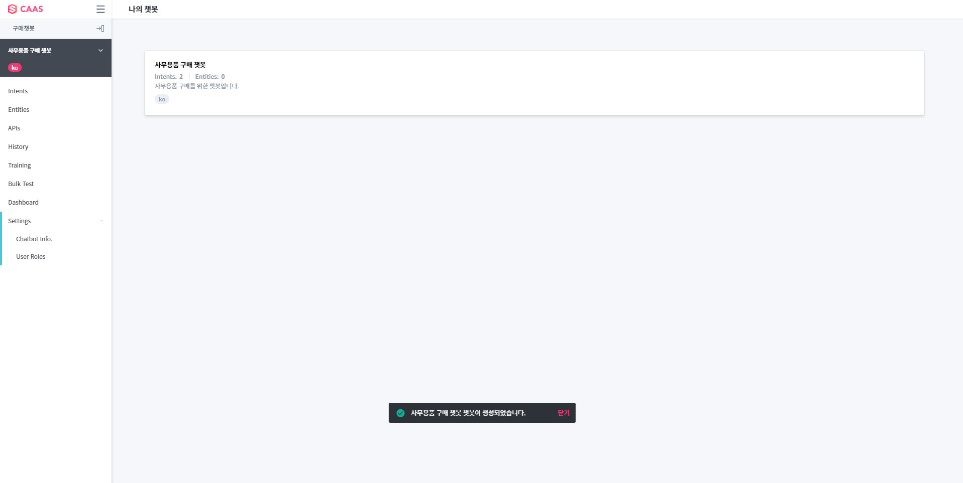 Chatbot이 생성되면 Chatbot 목록으로 화면이 이동되어 생성한 챗봇을 확인할 수 있습니다.