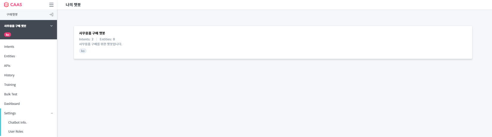 Intents 또는 Entities를 클릭하면 각각의 해당 메뉴로 이동합니다. Chatbot명을 클릭하여 선택한 Chatbot의 상세 정보 페이지에서 Chatbot의 기본정보를 변경하거나 삭제할 수 있습니다.