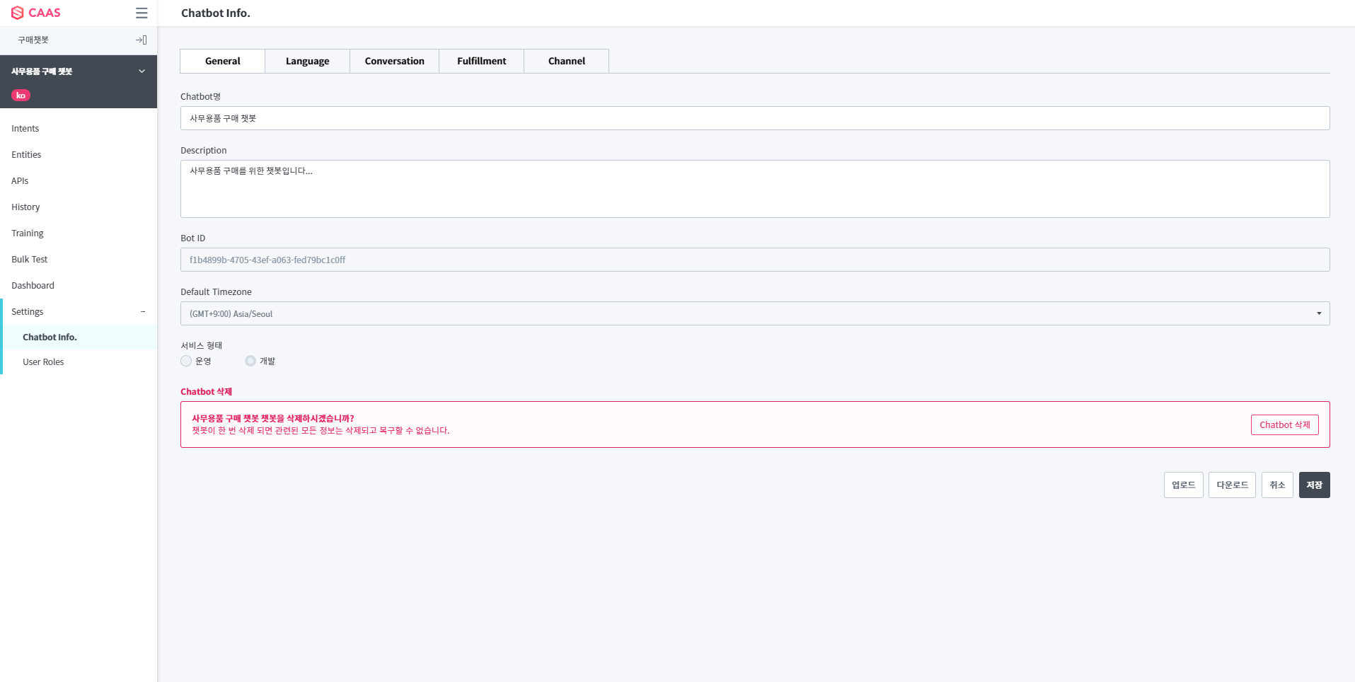 General 탭에서는 Chatbot명과 Description 수정이 가능합니다. 수정할 내용을 입력한 뒤 “저장” 버튼을 클릭합니다.