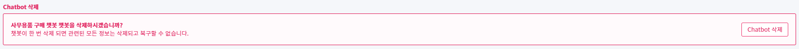 Chatbot 설정 화면의 하단에 있는 “Chatbot 삭제”기능은 매우 조심해야 하는 기능입니다. 등록되어 있는 모든 학습데이터와 대응되는 답변 시나리오가 삭제됩니다. 매우 매우 조심하셔야 합니다!