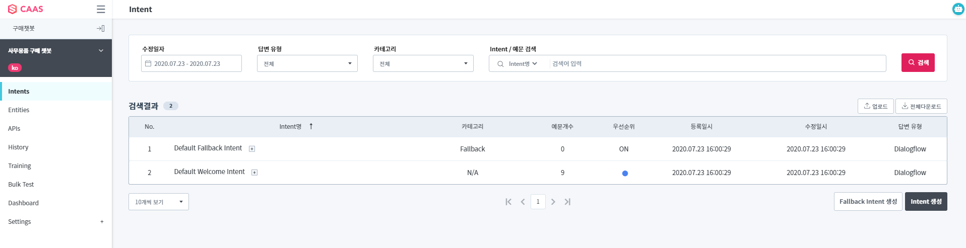 자동으로 생성된 Default Welcome Intent와 Default Fallback Intent는 Intents 목록 화면에서 확인 가능합니다.