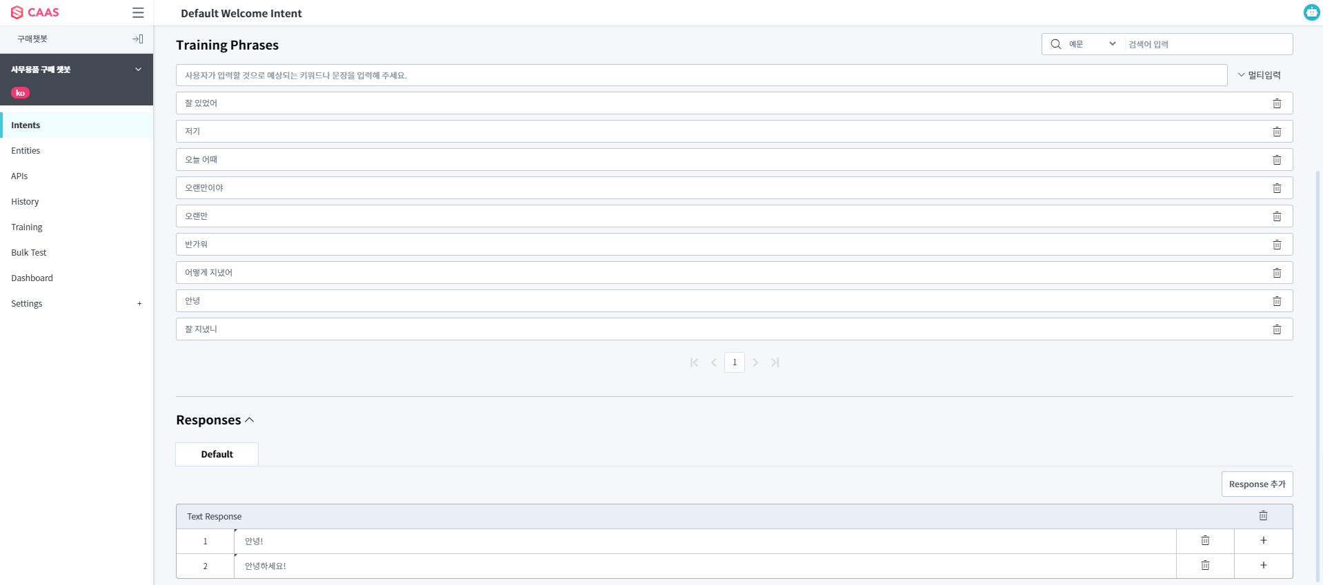 - Default Welcome Intent : 사용자가 Chatbot과 대화를 시작할 때 매칭되는 Intent