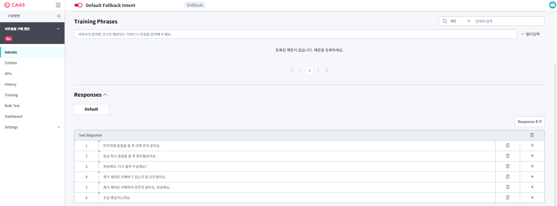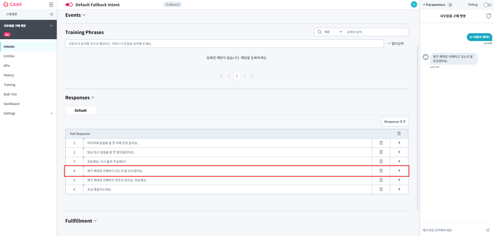 - Default Fallback Intent : Chatbot이 사용자의 표현을 이해하지 못했을 때 매칭되는 Intent