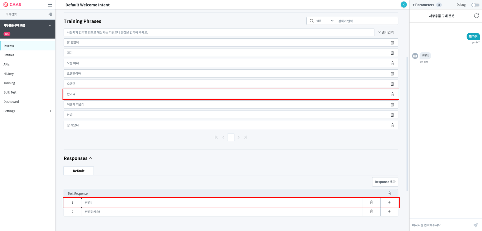 우측의 Simulator 영역에서 두 개의 Default Intent들을 활용하여 Chatbot과 간단한 대화를 나눠봅시다.