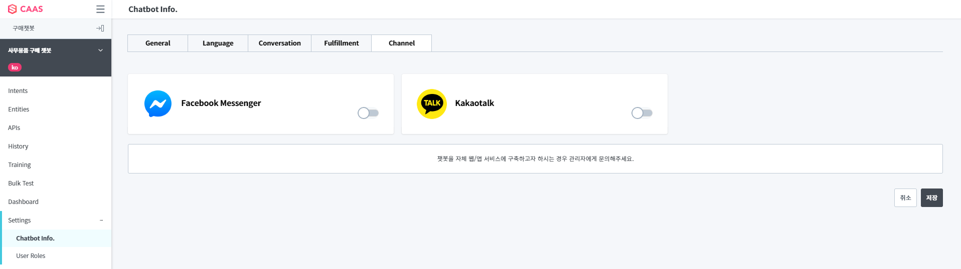 화면 위치 : [Settings] > [Chatbot Info.] > Channel 탭 선택