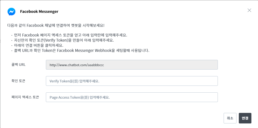 Facebook Messenger를 사용으로 선택하면 Facebook 설정 정보 입력 창이 뜹니다. 해당 창에서 필요 정보를 입력하고 연결 버튼을 클릭하면 Facebook Messenger에 연결이 가능합니다.