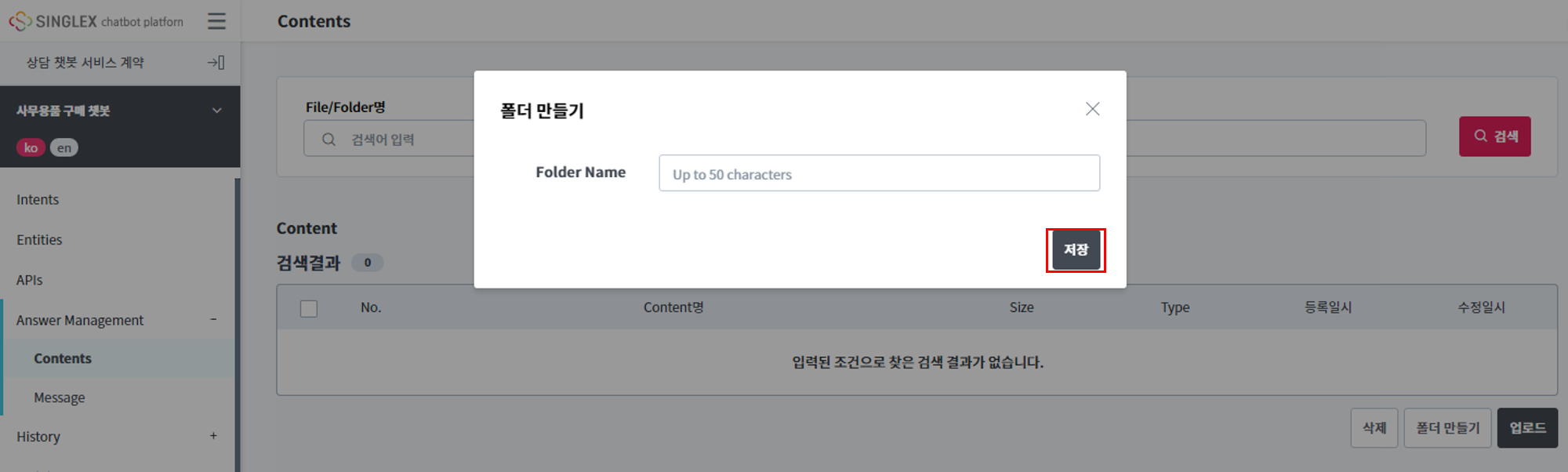 팝업 창에서 폴더 이름을 입력하고 저장 버튼을 클릭합니다.