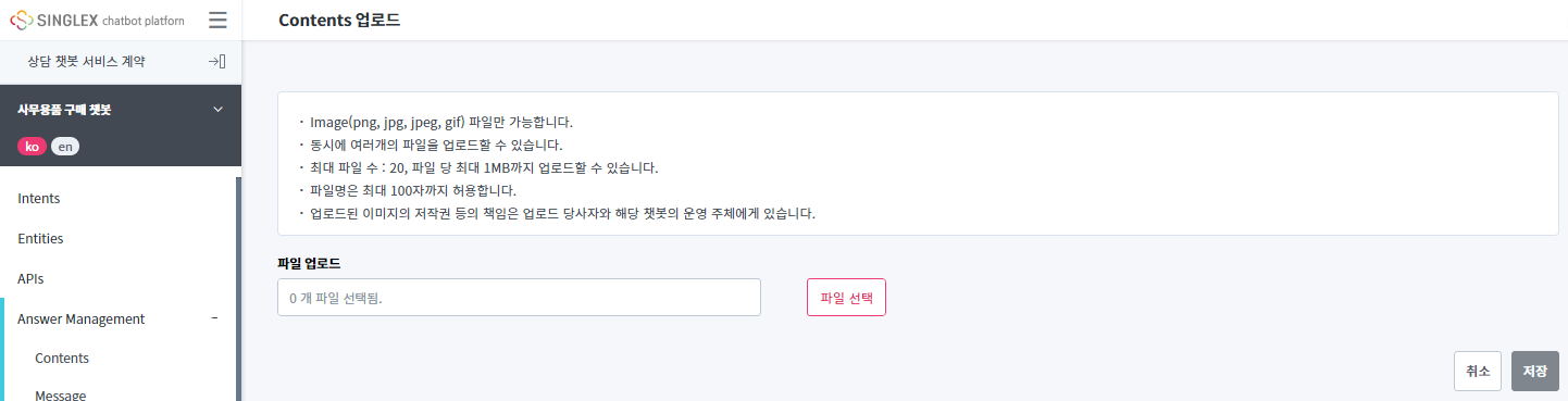 업로드 버튼을 클릭하면 Contents 업로드 화면으로 이동합니다.