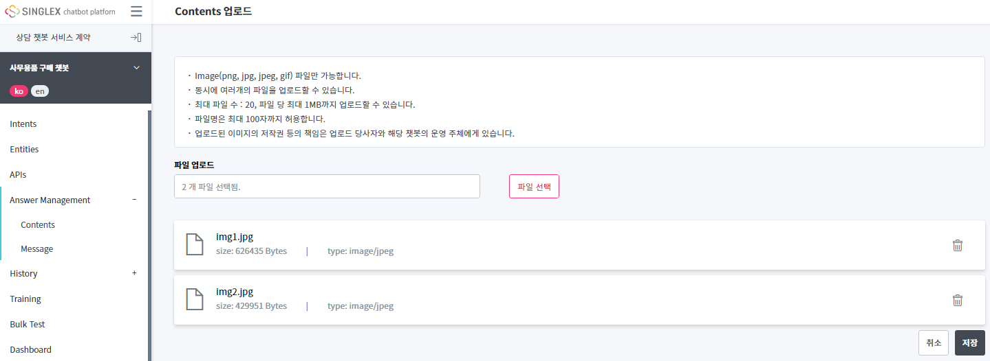 정상적인 이미지 파일을 선택했다면 화면에 파일 정보가 나타나고 저장 버튼을 클릭하여 업로드를 마칩니다.