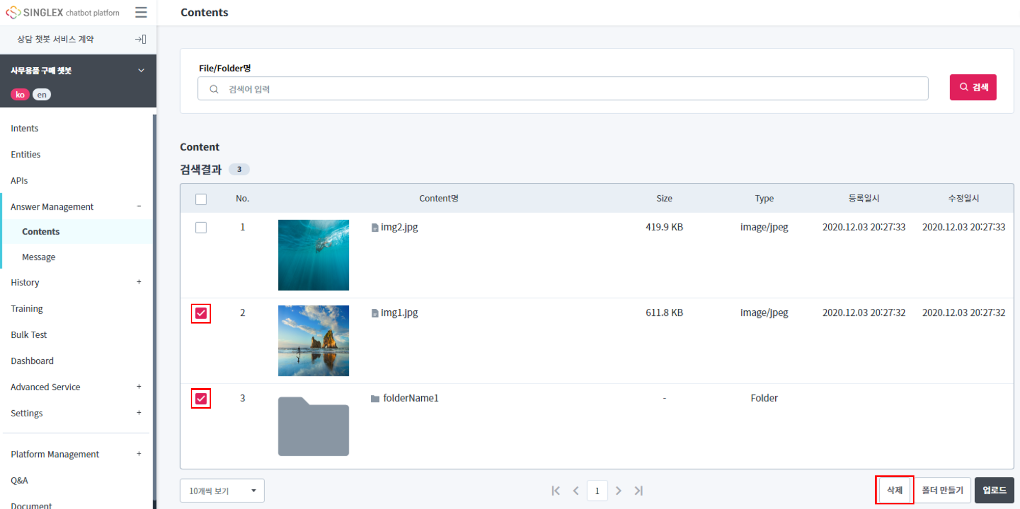 “파일을 삭제”할 경우 Chatflow의 Speak Node 답변에 사용되고 있는 이미지인지 확인 후 삭제하셔야 합니다. 사용중인 이미지가 삭제되면 답변에서 정상적인 이미지 url을 불러올 수 없게됩니다.