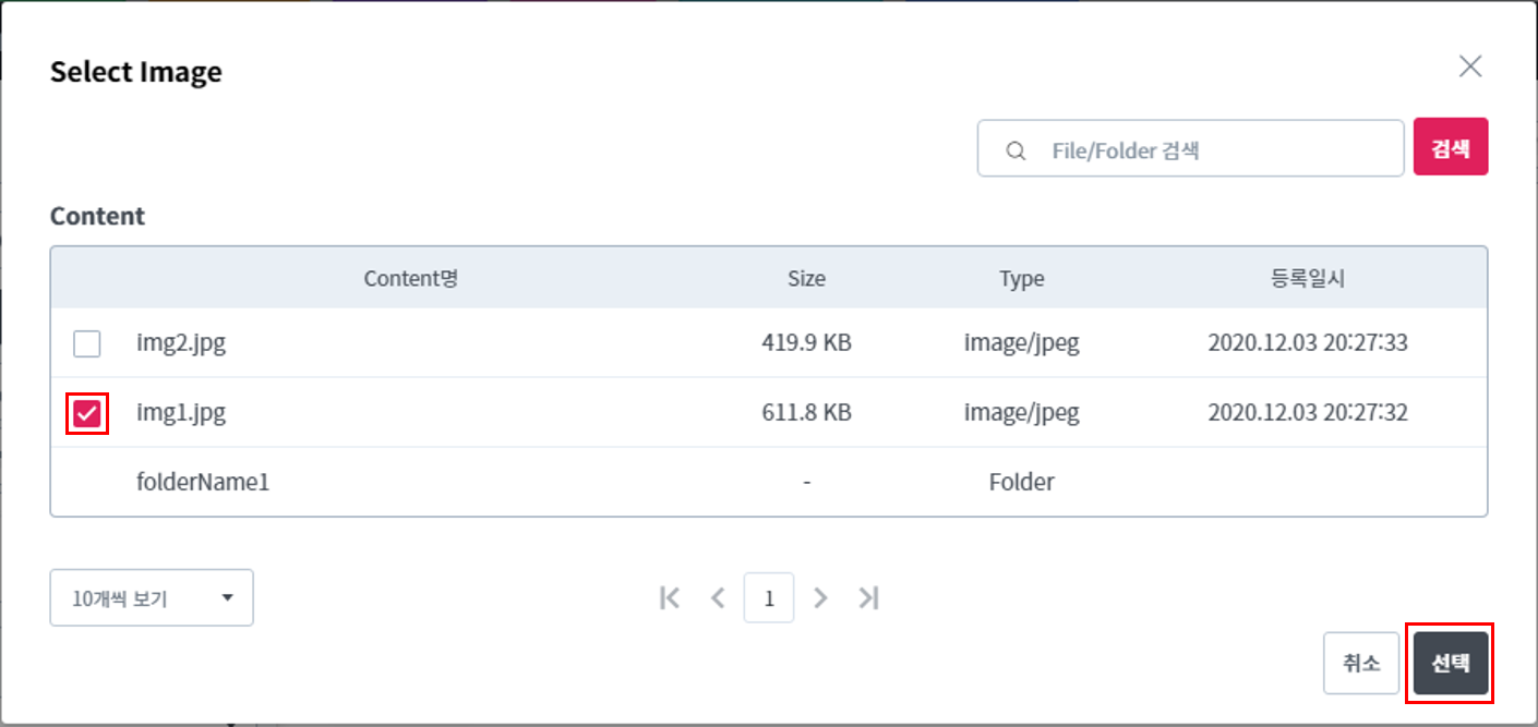 이미지 선택 팝업 화면에서 파일명을 클릭하면 새 탭에서 이미지를 볼 수 있습니다. 불러오고자 하는 이미지 파일을 선택 후 선택 버튼을 클릭하여 URL을 불러옵니다.
