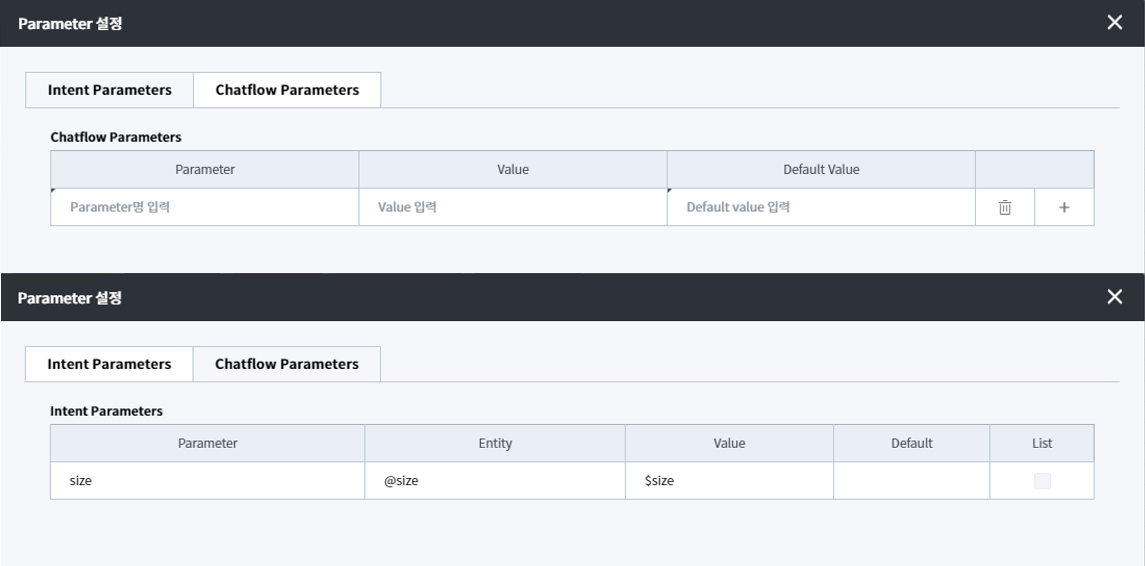 Chatflow Design Panel 우측 상단 [+ Parameter 추가] 버튼을 선택 하면 Chatflow Parameter를 등록할 수 있습니다. 또한 현재 Intent Parameters Tab에서 Intent Parameter 정보 역시 확인할 수 있습니다.