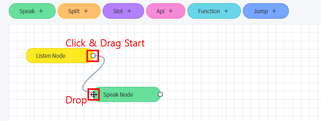 대화의 흐름을 만들기 위해서는 여러 기능을 하는 Node를 원하는 순서로 연결해야 합니다. Node 양쪽 작은 Circle이 연결점이 됩니다. Node간 연결점을 드래그해서 연결할 수 있습니다. 이때 왼쪽이 Node의 시작, 오른쪽이 Node의 끝으로 서로 다른 Node의 시작과 끝을 연결해주어야 합니다. Split Node를 제외한 나머지 Node는 하나의 연결만 허용합니다.
