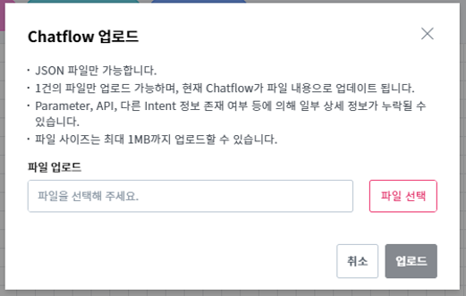 다운로드 받은 파일을 선택하여 업로드 하면 파일 내의 정보를 토대로 Chatflow를 그리게 됩니다. 단, 현재 그려진 Chatflow 정보는 모두 삭제됩니다. 파일 내에 비정상적인 정보가 존재할 경우 Node, Parameter가 등록되지 않을 수 있으며 확인 후 수정이 가능한 영역은 비정상 영역으로 표시됩니다.