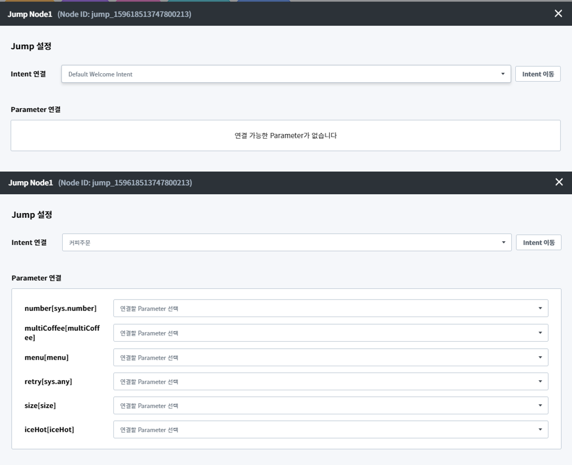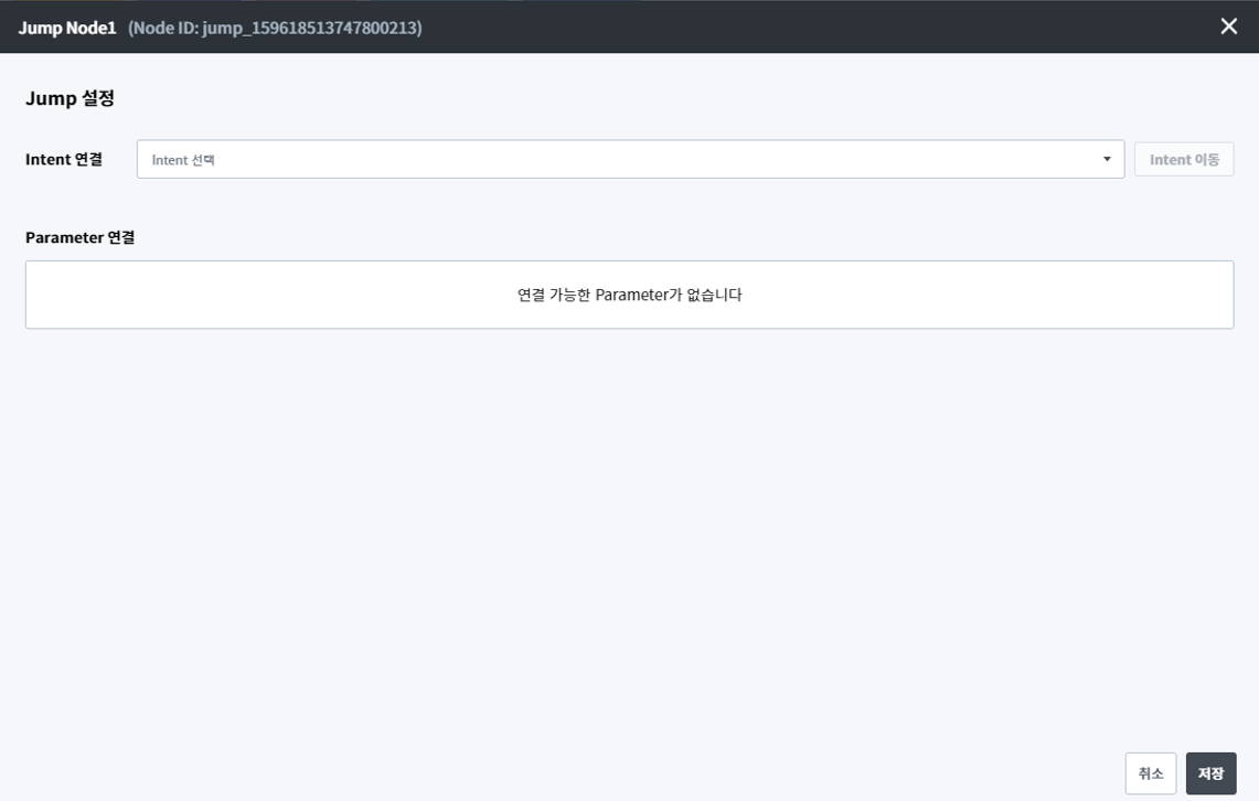 Jump Node는 Speak Node에서 확인했던 Intent 호출 버튼과 동일한 역할을 합니다. 다만, 동작하는 시점의 차이가 있을 뿐입니다. Intent 호출 버튼은 버튼을 클릭했을 때 동작하지만 Jump Node는 대화가 흘러가는 도중에 자연스럽게 동작합니다.