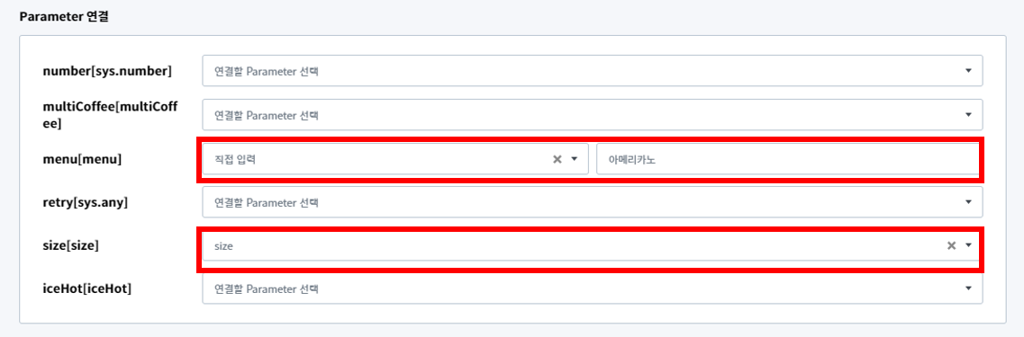 연결 가능한 Parameter가 존재할 경우 우측 Selectbox에서는 현재 Intent에 등록된 모든 Parameter 목록과 직접입력 항목을 확인할 수 있습니다. Parameter를 선택할 경우 현재 Parameter에 담겨 있는 정보를 전달할 것이고 직접입력을 선택할 경우 개발자가 직접 전달할 정보를 기재할 수 있습니다. 직접입력 선택시 정보는 Text만 전달이 가능하며 입력 항목을 비워둘 수 없습니다.