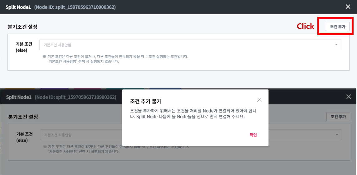 Split Node를 사용하기 위해서는 위 이미지와 같이 다음 Node를 먼저 연결해줘야만 합니다. 연결된 Node가 없으면 상세 Popup 내에서 조건을 추가할 수 없습니다.