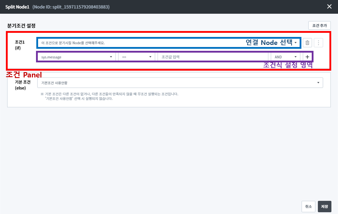 Panel 하나 당 연결할 Node 하나를 선택할 수 있고 세부적인 조건식을 추가할 수 있습니다. 하나의 조건 Panel에 최대 50개의 조건식을 추가할 수 있으며 모든 조건식은 AND, OR 중 하나의 연산자로 묶입니다. 각각의 영역을 상세하게 살펴보겠습니다.