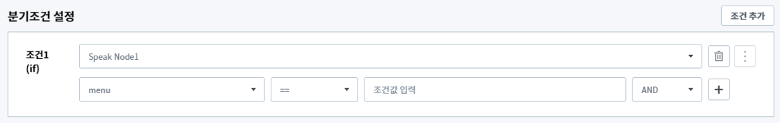 위와 같이 조건을 정의할 경우 menu 라는 parameter의 값이 빈 값일 때, 즉 menu에 대한 정보가 없을 때 ‘Speak Node 1’로 연결함을 의미합니다.