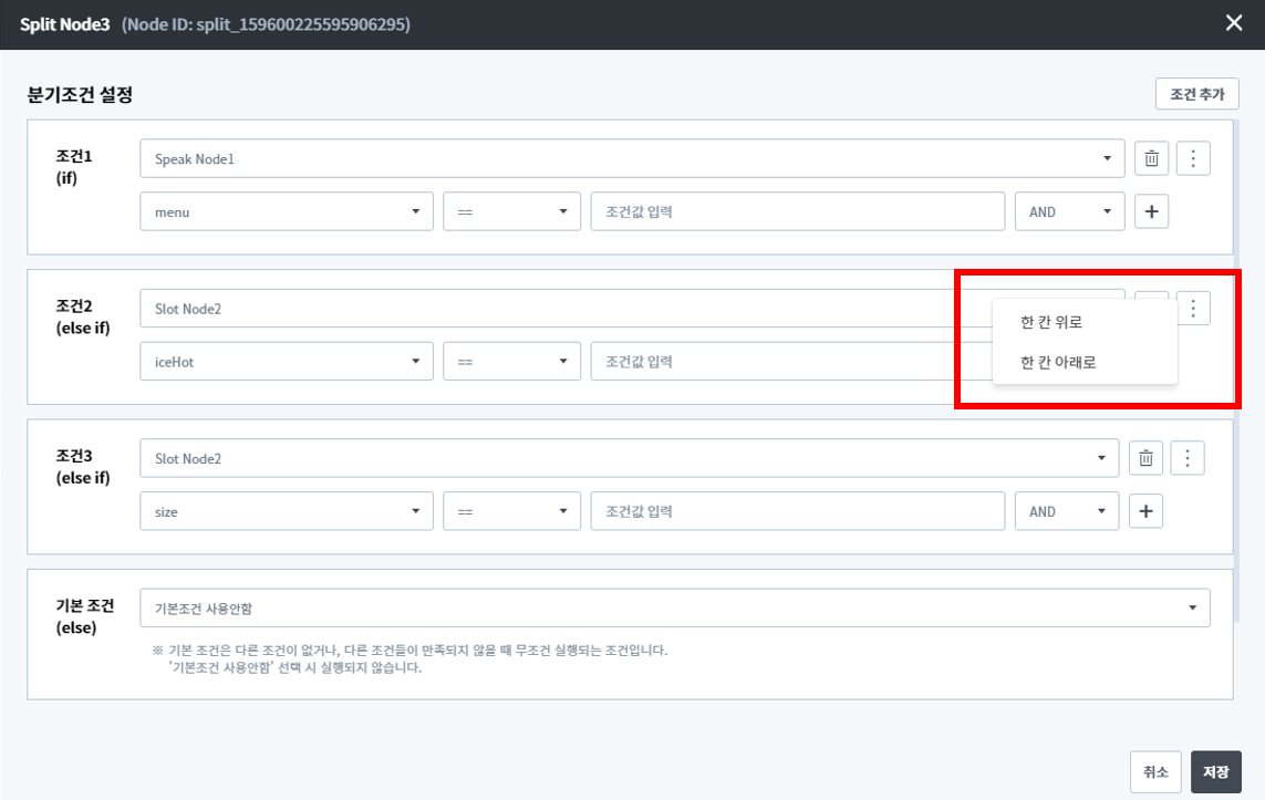 조건 Panel의 순서가 중요하기 때문에 각 조건 Panel 순서를 쉽게 바꿀 수 있도록 이동 버튼()을 제공하고 있습니다.
