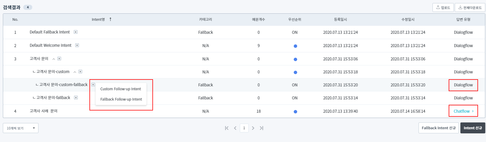 아래의 화면과 같이 Intent 목록에서 Intent의 답변 유형이 Dialogflow 형인 Intent만 Follow-up Intent 생성이 가능합니다.해당 Intent 명의 오른쪽에 있는 + 버튼을 클릭해서, Custom / Fallback Follow-up Intent를 생성할 수 있습니다.