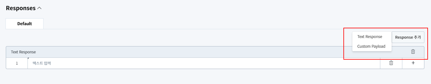 아래 화면과 같이 Default 탭에서는 Text Response와 Custom Payload 응답을 지원합니다.
