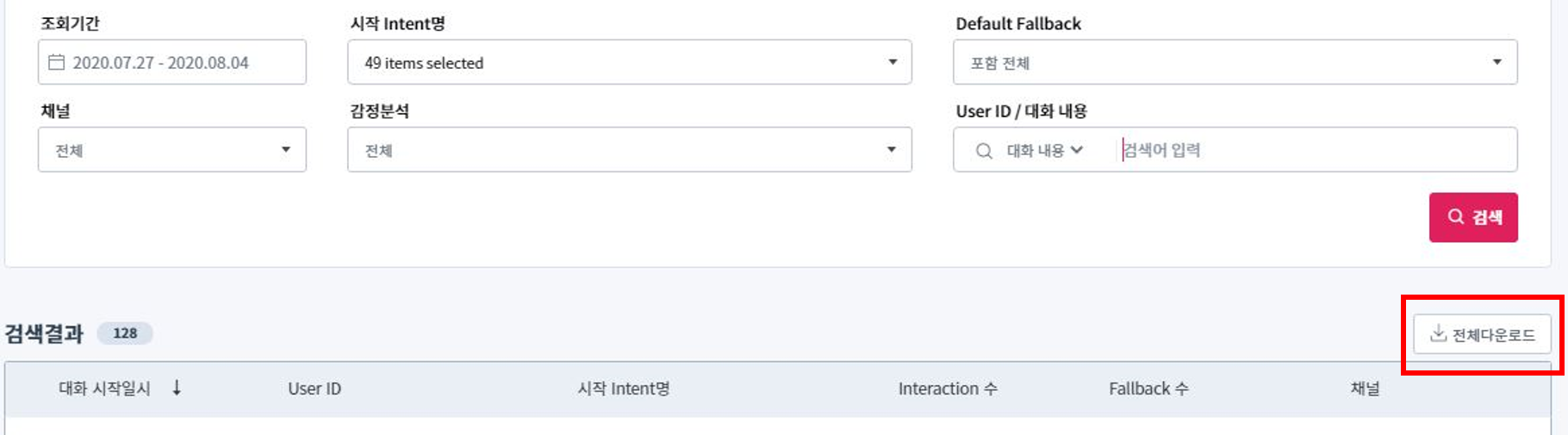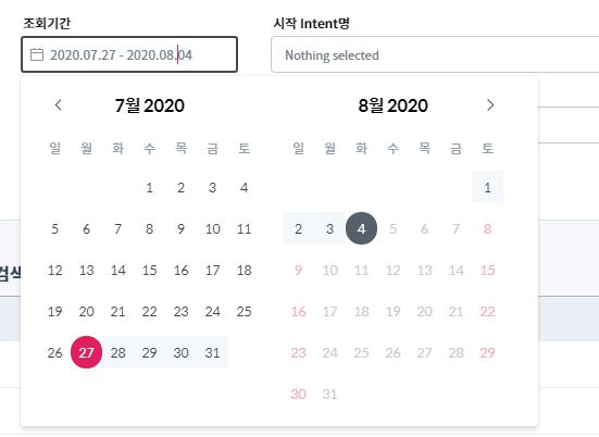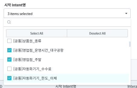 시작 Intent명 : 대화가 시작된 Intent를 선택하여 조회가 가능합니다. 다중선택이 가능하며 아무것도 선택하지 않은 경우 Intent 전체 기준으로 조회됩니다.