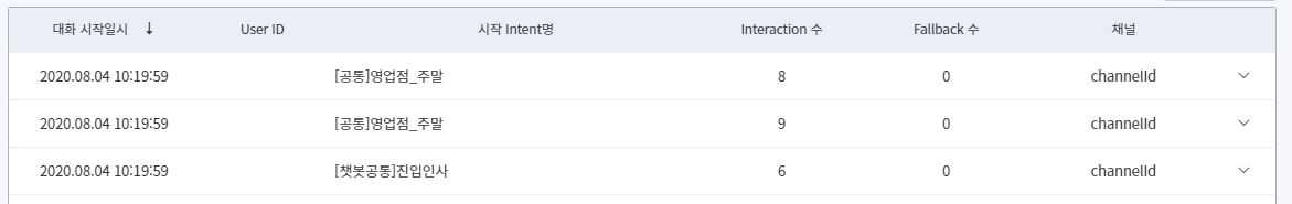 | 대화 시작 일시 | 대화 세션의 시작 일시를 뜻합니다. Chatbot 개발자 PC의 시간대(Timezone) 기준으로 보여집니다. |