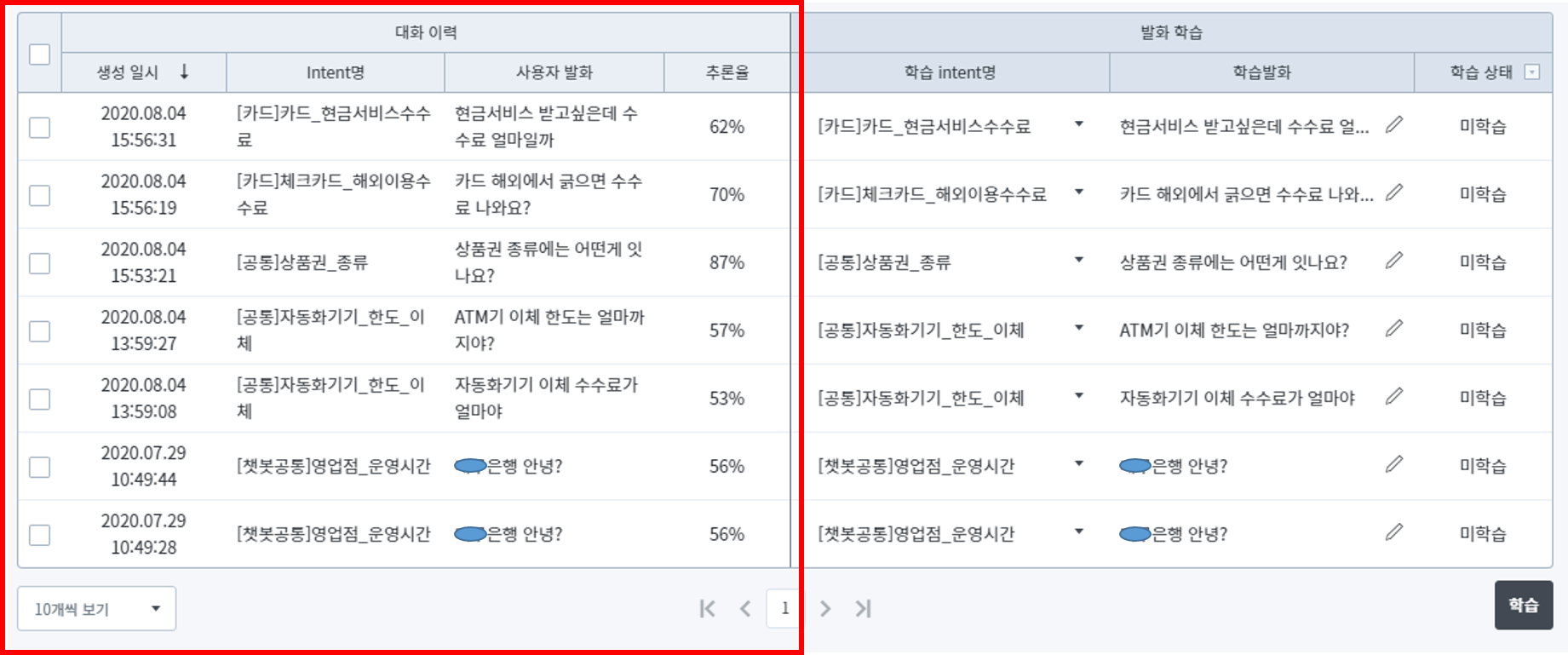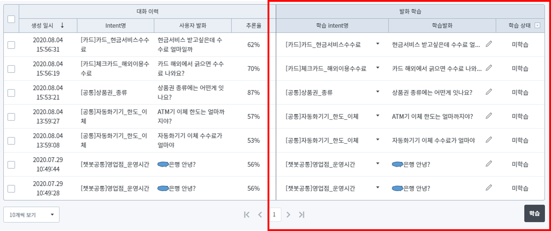 발화 학습 테이블에서는 아래와 같은 데이터를 수정하고 학습에 반영할 수 있습니다.