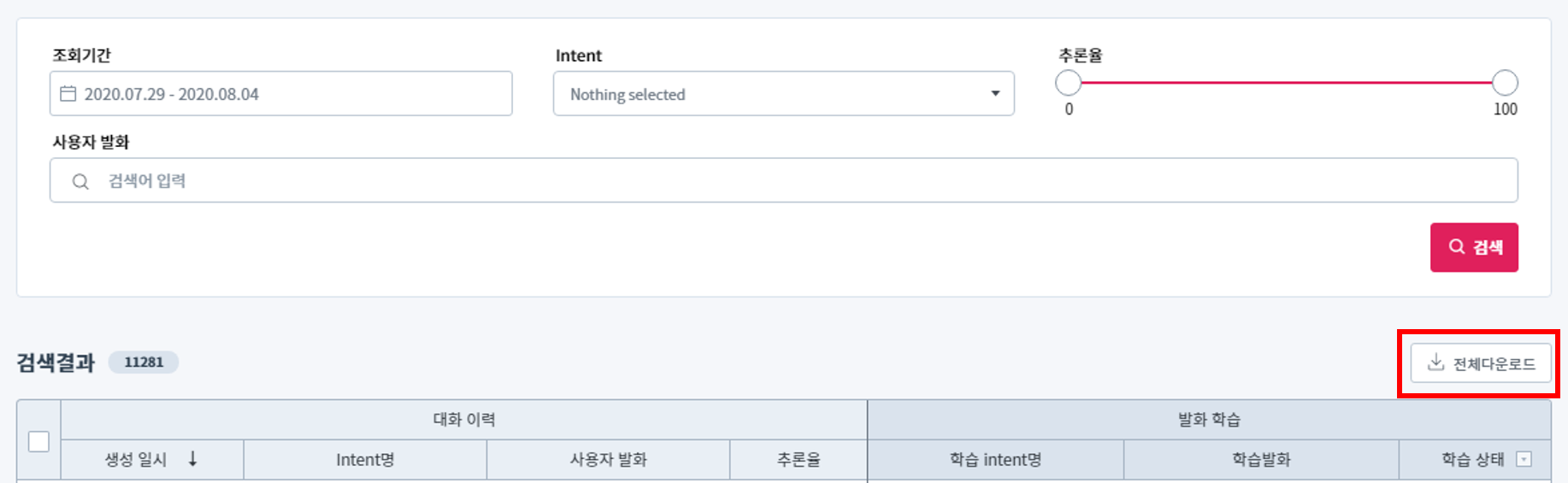 대화 이력 테이블은 사용자 발화별 의도 분류 결과를 포함하고 있으며 아래와 같은 정보를 확인할 수 있습니다.
