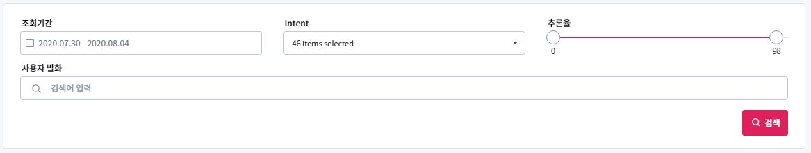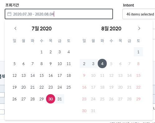 Intent : 발화가 분류된 의도를 선택해서 조회할 수 있습니다. 다중선택이 가능하며 아무것도 선택하지 않은 경우 Intent 전체 기준으로 조회됩니다.