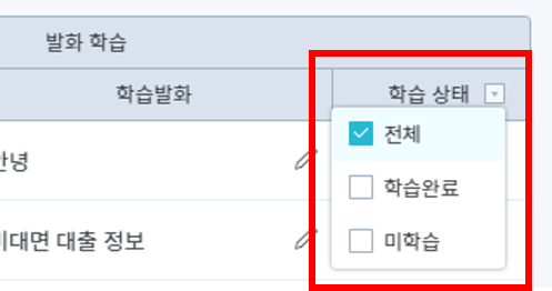 학습 상태 : 학습 상태 여부를 선택하여 조회할 수 있습니다. 발화 학습의 학습 상태 컬럼 옆 화살표를 클릭하면 선택 가능합니다. 아무것도 선택하지 않은 경우 전체 기준으로 조회됩니다.