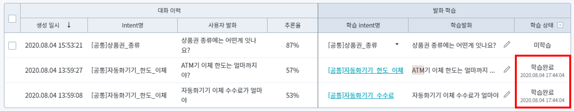 학습 상태 : 해당 발화의 학습 여부를 나타냅니다. 학습이 완료된 발화인 경우 학습완료 된 시간을 확인할 수 있으며, 마우스를 가져다대면 학습한 계정 정보를 확인할 수 있습니다.