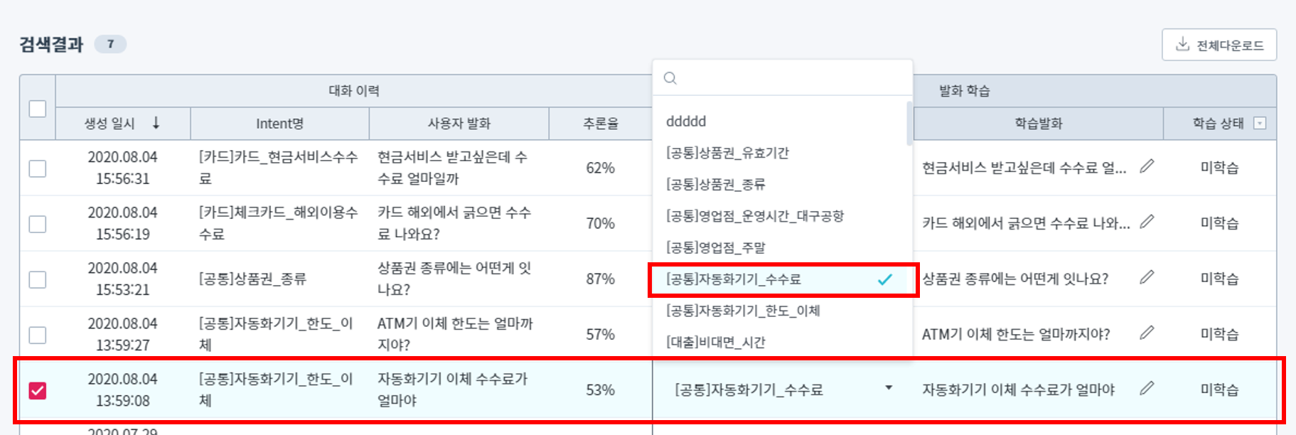 학습 Intent명 : 해당 발화의 의도분류 결과가 잘못된 경우, 수정해서 학습할 Intent명을 선택해서 변경할 수 있습니다.