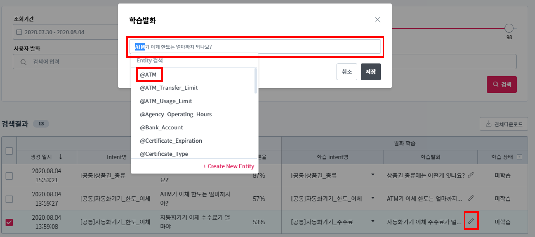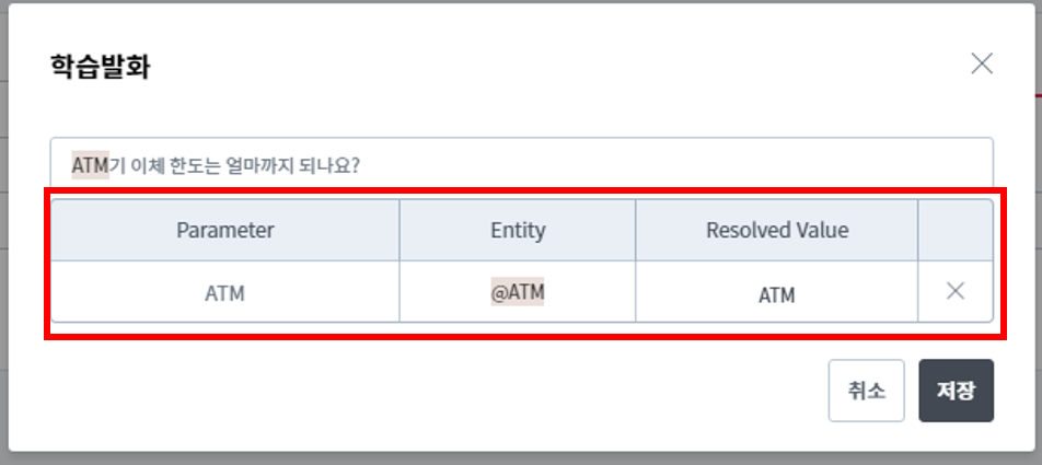 예를 들어, “ATM기 이체 한도는 얼마까지야?” 라는 발화를 수정해보겠습니다. 학습발화 옆 ‘연필’모양의 아이콘을 클릭하면 아래와 같은 팝업창이 나타나게 됩니다.